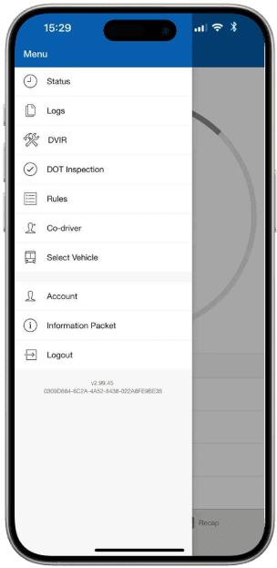 Your current duty status is displayed in the status circle, along with available or reset hours, on the Status page.