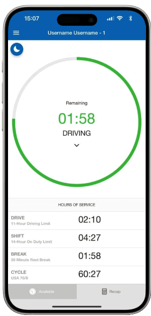 Available driving hours, break requirements, on-duty limits, and off-duty times are all calculated automatically.